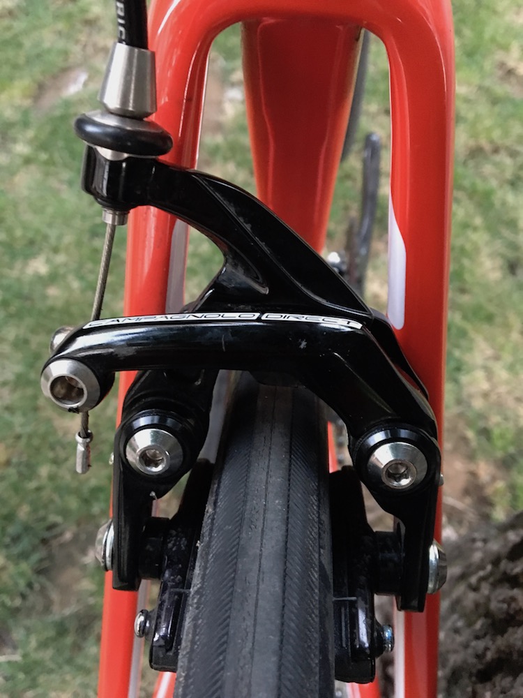 Un cambio importante para el modelo 2018 es que la bici tiene anclaje directo de frenos. Este es el nuevo diseño del caliper con dos ejes y puntos de anclaje, a diferencia del anclaje central tradicional. Lo desarrolló Shimano hace algunos años y tanto Campagnolo como Sram introdujeron su versión este 2018 (El equipo Movistar, que corre con Canyon y Campagnolo, hasta el año pasado llevaba frenos Shimano Dura-Ace con los logos borrados, ya que era el mejor disponible y Campagnolo no tenía). Son considerablemente superiores a cualquier otro diseño de freno a llanta. Gran rigidez, con buena potencia y modulación.