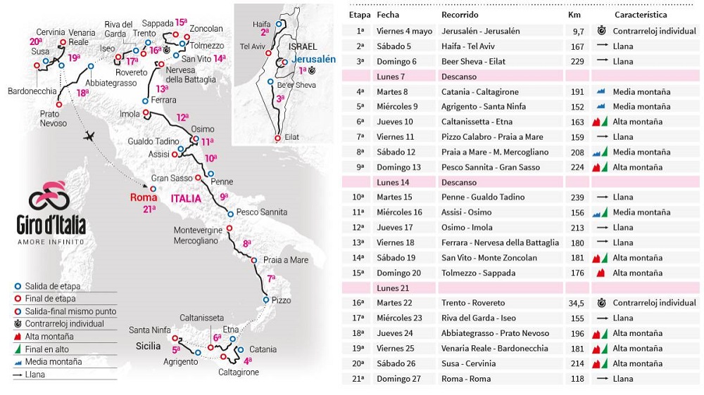 La edición de este año estará compuesta por dos etapas contrarreloj, siete etapas para velocistas, ocho duras jornadas de alta montaña y otras cuatro sobre terreno menos escarpado. La gran novedad es que este año el Giro comenzará en Israel, con una primera etapa de contrarreloj individual de 9,7 kilómetros.
