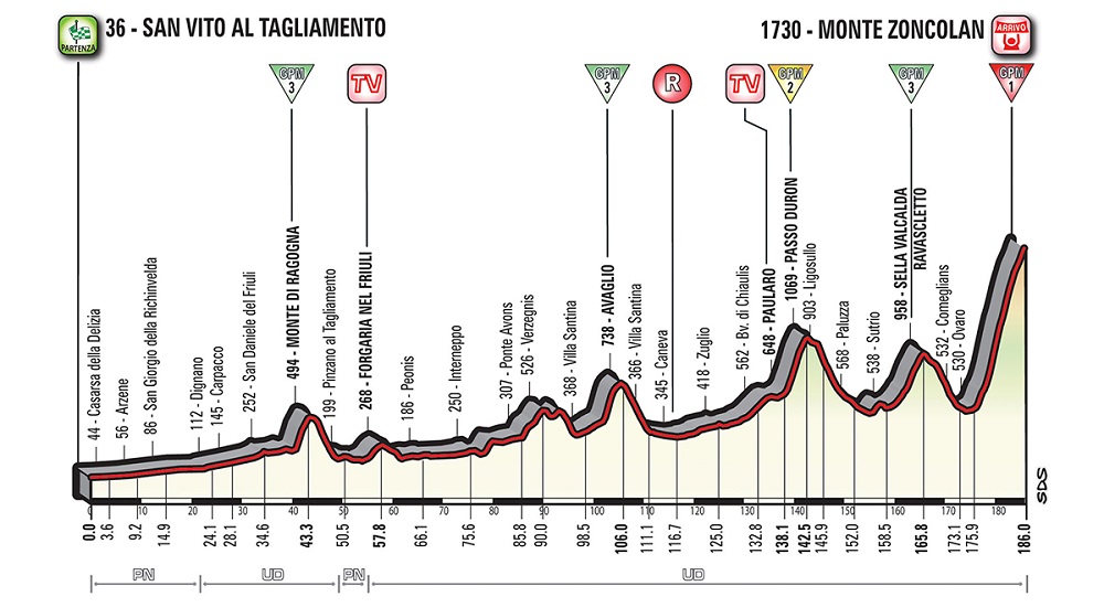 Mañana viene lo bueno, 181 kilómetros de etapa de montaña con 5 puertos y el ascenso final al Zoncolan, una subida de 10 kilómetros al 11,8 por ciento de pendiente media y rampas de hasta el 23% que alcanzarán la cima a 1.730 metros de altitud tras superar un desnivel de 1.203 metros. ¡Momento de que los favoritos den todo lo que tienen!