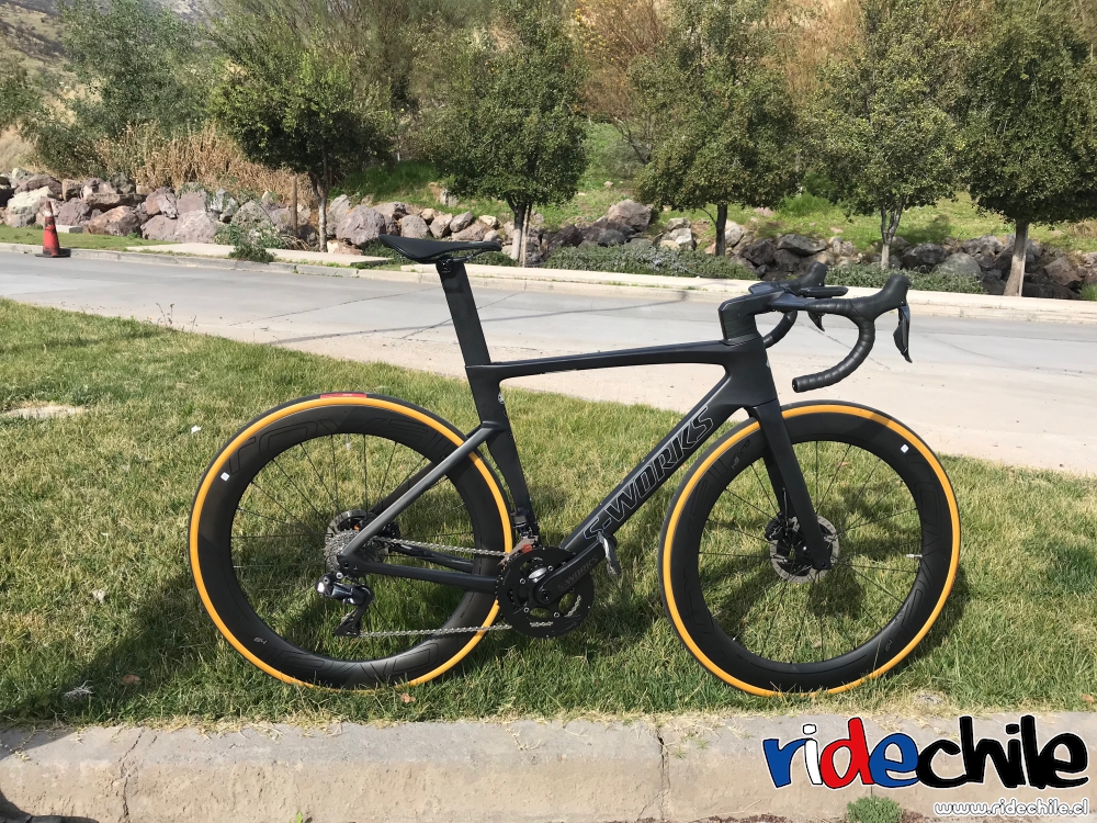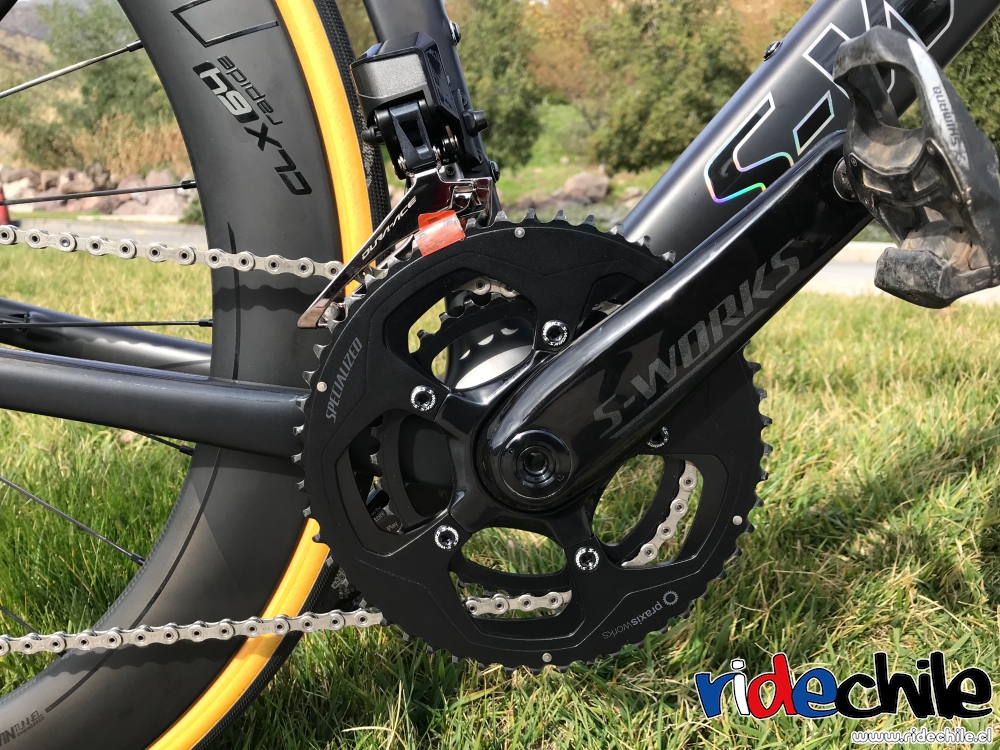 Los cambios son electrónicos Shimano Dura-Ace Di2 9170 integrado en el tubo de sillín. Un sutil toque, respuesta inmediata y ajuste perfecto. Specialized decidió incluir en este modelo su propio Power Meter en ambas bielas. Los rodamientos de los pedales también son de cerámica.