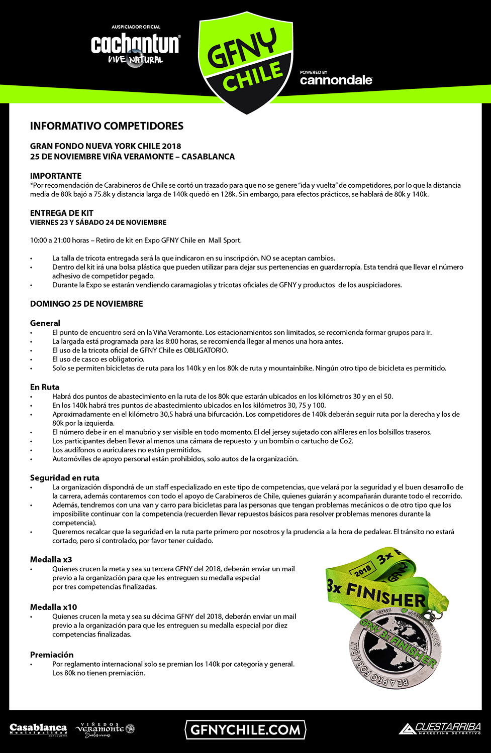 Nos informan desde la organización del Gran Fondo New York Chile que hay un cambio de última hora en los circuitos. Por recomendación de Carabineros se recortó un fragmento del trazado, por lo que la distancia de 140K quedará en 128K, y la distancia de 80K en 75,8K.