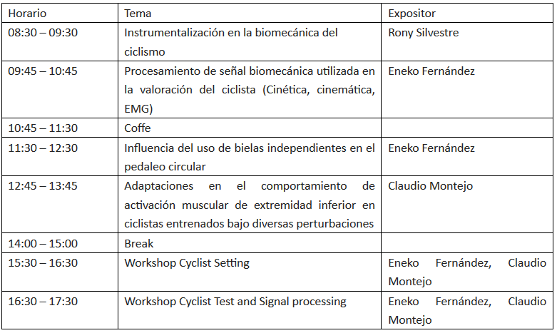 Durante el día se realizarán 6 charlas centradas en la Biomecánica, dirigidas por expertos internacionales como el dr. Eneko Fernández Peña, y los kinesiólogos Rony Silvestre y Claudio Montejo.