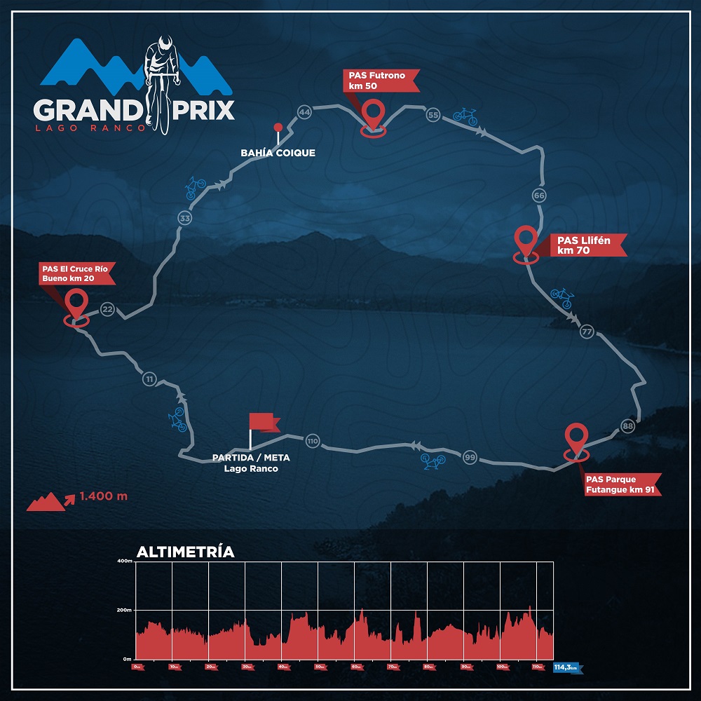 El Grand Prix Lago Ranco se realiza en la Región de Los Ríos alrededor de la cuenca del Lago Ranco en un entorno espectacular. La gran novedad de este año es que, a la distancia larga de 114 kilómetros con 1.400 metros de ascenso acumulado, se suma una nueva distancia más corta de 65 kilómetros partiendo desde Futrono.