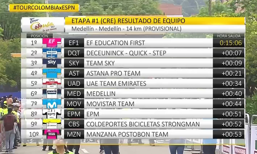 Tras ellos, estuvieron los equipos Deceuninck-Quick-Step (+0:07), Team Sky (+0:09), Astana (+0:21), UAE Team Emirates (+0:34), Medellín (+0:40), Movistar (+0:44), EPM (+0:51), Coldeportes Bicicletas Strongman (+0:52) y Manzana Postobom Team (+0:53) cerrando los 10 primeros lugares.