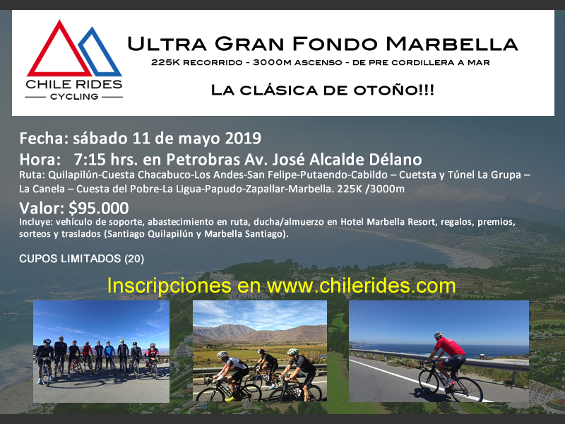 El sábado 11 de mayo Chile Rides Cycling vuelve a organizar el Ultra Gran Fondo Marbella, una jornada de ciclismo en ruta de 225 kilómetros por la Región de Valparaíso.