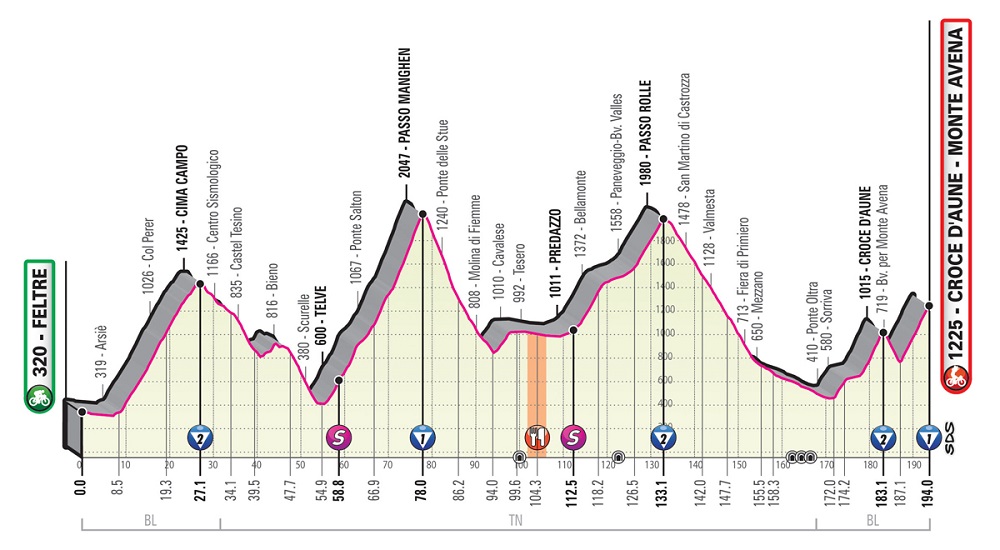 Mañana viene la considerada segunda etapa reina de este año. Prácticamente todo montaña con más de 5.000 metros de desnivel acumulado. Arranca con 10 kilómetros llanos, los únicos de todo el día. Los otros 184 son de subida o bajada. El primero es Cima Campo (2ª), después un descanso y llega la gran escalada del día, el Passo Manghen (1ª). Luego el Passo Roile (2ª) y el Croce d’Aune (2ª), cuyo descenso conducirá hasta el final en alto de Monte Avena (1ª).