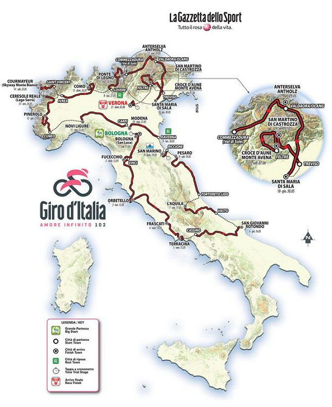 El Giro de Italia culminará el domingo 2 de junio, con su 21ª etapa en una emocionante carrera contrarreloj de 15,6 kilómetros, partiendo en Verona (Fiera) y llegada en la Arena di Verona. El recorrido Verona-Verona, contemplará un ligero ascenso en Torricelle de 4,5 kilómetros para el posterior descenso que colocará con inicio y salida en Verona que coronará al monarca absoluto y portador de la Maglia Rosa.