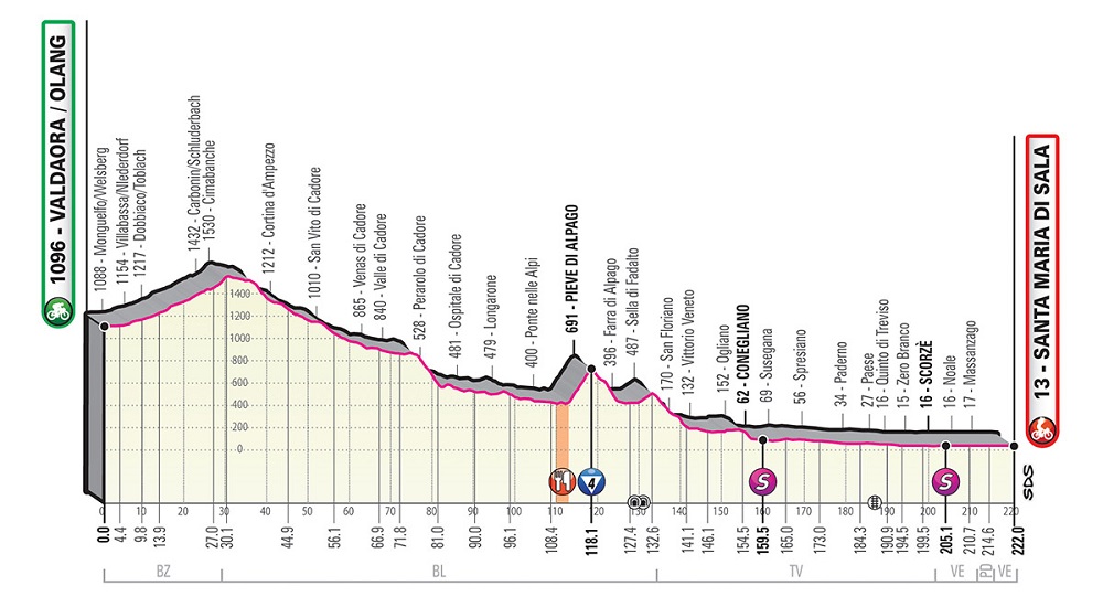 Mañana descansa la montaña y volvemos a tener otra etapa plana. De hecho, gran parte de los 222 kilómetros que separan Valdaora de Santa María Di Sala son cuesta abajo. Probablemente el último día en esta edición del Giro para que se luzcan los velocistas.