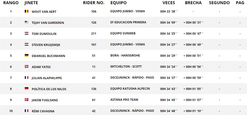 Este miércoles fue la 4ta etapa del Critérium du Dauphiné, que tuvo un recorrido contrarreloj de 26,1 km en Roanne, donde resultó ganador el belga Wout van Aert (Jumbo-Visma) con 33:38, segundo lugar para Tejay Van Garderen con 34:09 y el podio lo completó el holandés Tom Dumoulin con 34:25.