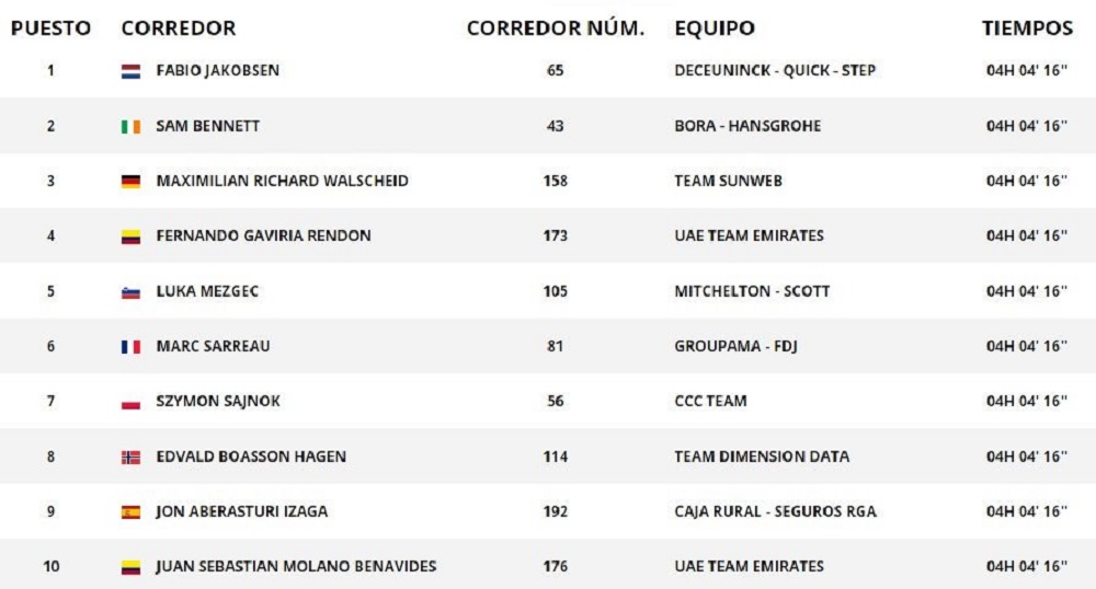 Jakobsen se estrenó como ganador de etapa en La Vuelta luego de cruzar la meta en El Puig marcando crono de 4 horas, 4 minutos y 16 segundos con un gran sprint y sacando rédito del trabajo de su equipo donde Rémi Cavagna limpió el camino y Zdenek Stybar y Max Richeze forjaron un lanzamiento.