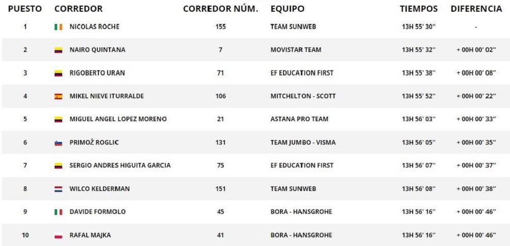 El irlandés Nicolas Roche (Team Sunweb) continúa por tercer día como líder de la clasificación acumulando crono 13h 55′ 30».