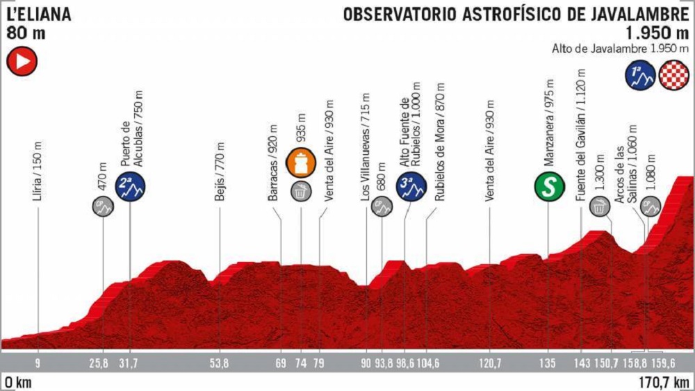 Este miércoles se llevará a cabo la 5ª etapa de La Vuelta desde L’ Eliana hasta Observatorio Astrofísico de Javalambre. Una ruta accidentada de 170,7 km que podría desgastar al pelotón y que ofrecerá un puerto inédito a partir del kilómetro 31.7, el Puerto de Alcublas, de Categoría 2 con 5.9 km de subida a 4.7 % de desnivel.
