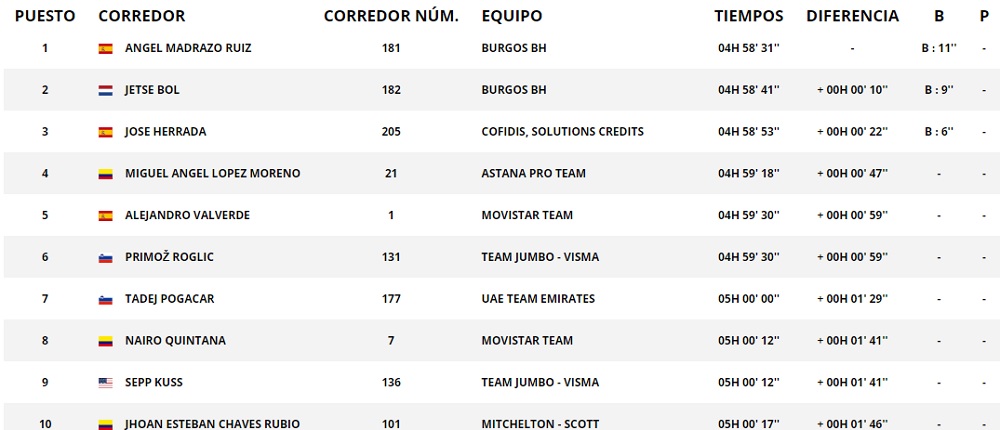 Asimismo, el escalador se afianzó en la clasificación de montaña gracias a su victoria. El español hizo tiempo 04H 58′ 31′ tras despegarse en el último kilómetro con la complicidad de su compañero el holandés Jetse Bol. En tercer lugar cruzó la meta el español de Cofidis, Solutions Credits José Herrada.
