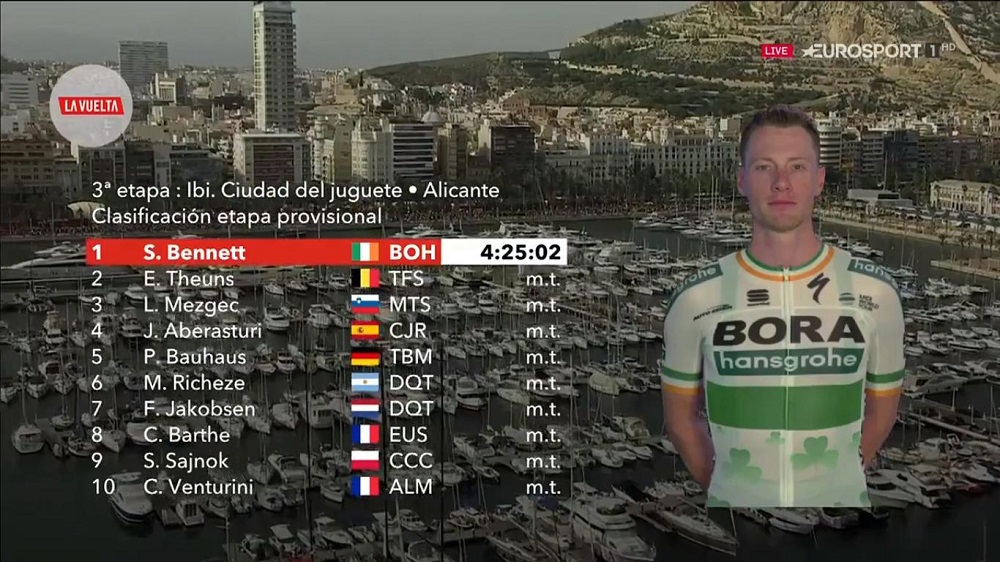 Etapa histórica con tintes irlandeses. Finalizó la etapa 3 de La Vuelta a España este lunes 26 de agosto, con la victoria del irlandés Sam Bennett (Bora-Hansgrohe) en un tramo de 188 km, que estuvo marcada por ser una de las etapas claves para los sprinters. Es la primera vez en la historia de La Vuelta que un irlandés gana la etapa, mientras otro lidera la clasificación general.