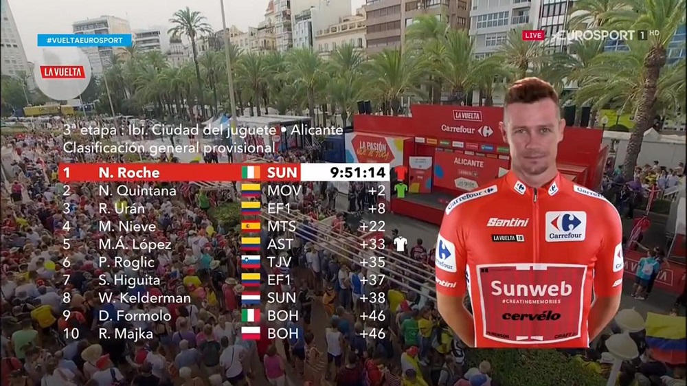 Luego de esta etapa 3 y con 401 km recorridos en esta Vuelta 2019, el maillot rojo de líder sigue en manos de Nicolas Roche (Team Sunweb) con un tiempo acumulado de 9:51:14, por segunda jornada consecutiva.