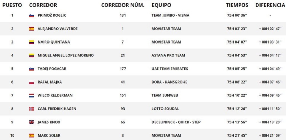 Primoz Roglic (Jumbo-Visma) parece acariciar cada vez más la gloria tras mantenerse un día más en la cima de la general cuando restan sólo dos etapas antes de llegar a Madrid. El esloveno sigue vistiendo el maillot rojo con tiempo acumulado de 75h 00′ 33», así como también sigue al frente de la clasificación por puntos, pero quién vestirá el maillot verde Skoda será el segundo mejor clasificado Tadej Pogacar (UAE Team Emirates) con 92 puntos.