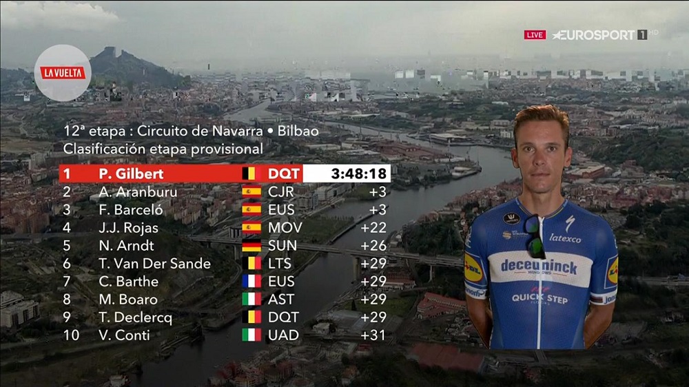 Gilbert completó el recorrido en 03h 48′ 18» luego de entrar en la fuga del día hacia el Alto de Arraiz, la última subida que otorgaba puntos, para atacar. Con esta victoria Gilbert ya suma 6 de etapa en La Vuelta.
