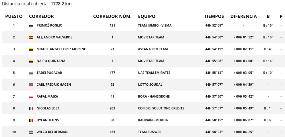No hubo alteración en los lideratos, manteniéndose Primoz Roglic (Jumbo-Visma) en la cima de la general y vistiendo el maillot rojo con tiempo acumulado de 44h 52′ 08», así como también sigue al frente de la clasificación por puntos pero quién vestirá el maillot verde Skoda nuevamente será el colombiano Nairo Quintana (Team Movistar).