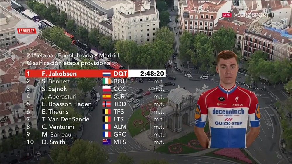 Esta última etapa, de 106 km de recorrido donde partieron los 153 ciclistas desde Fuenlabrada hasta la plaza de Cibeles de Madrid, terminó con la victoria de Jakobsen (Deceuninck – Quick Step) con crono de 2:48:20, el segundo lugar fue para el irlandés Sam Bennett (Bora – Hansgrohe) y el tercer lugar fue para el polaco Szymon Sajnok (CCC Team).