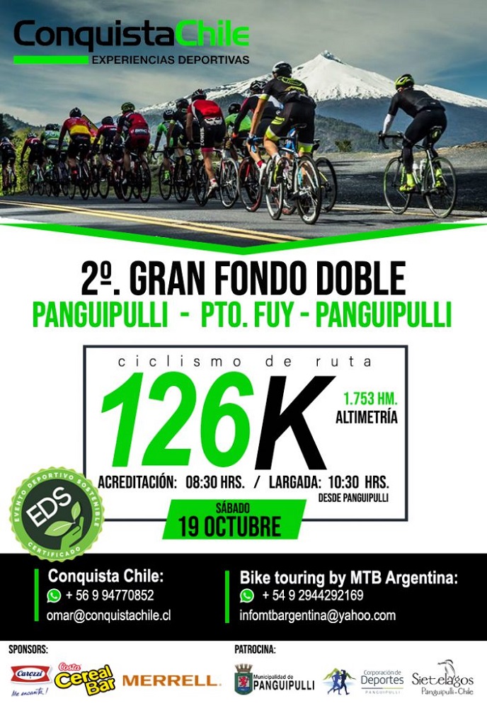 El sábado 19 de octubre se realizará entre las ciudades de Panguipulli y Puerto Fuy la competencia de ciclismo de ruta Gran Fondo Doble 2019, en la Región de los Ríos con la organización de Conquista Chile.