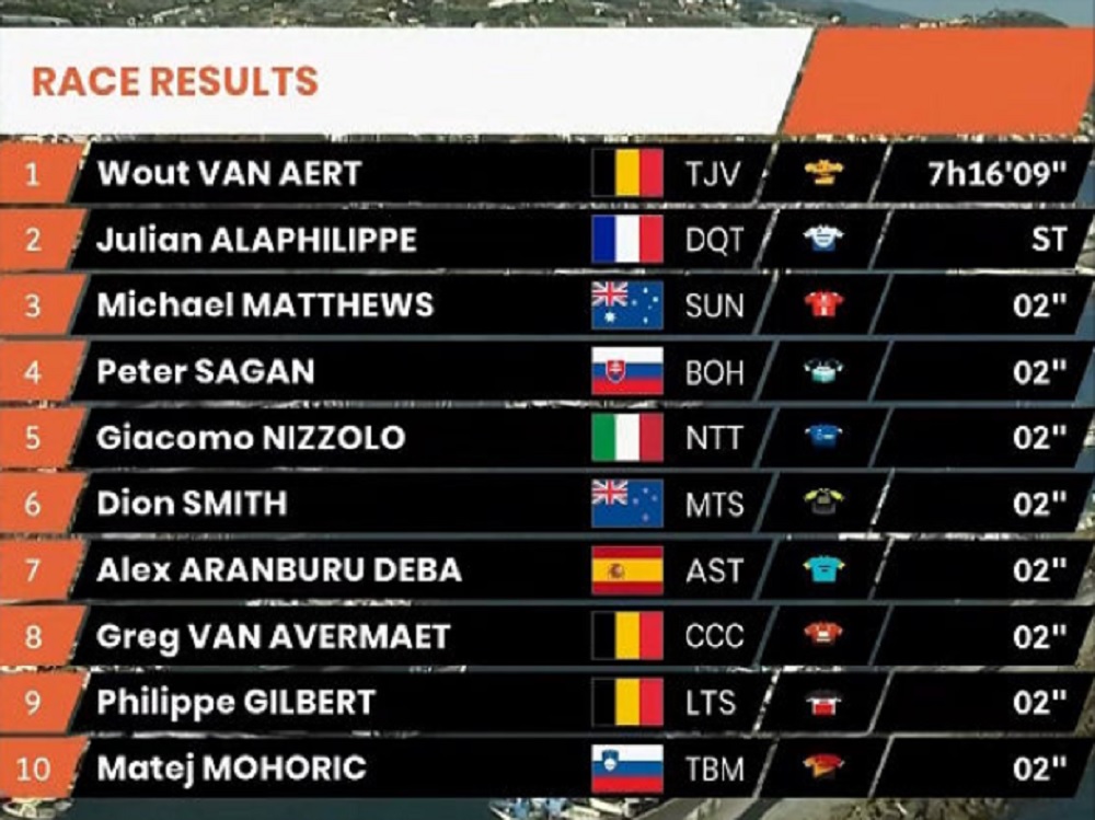 La carrera, que tuvo una distancia de 305 km, tuvo como segundo lugar al francés Julian Alaphilippe (Deceuninck-Quick Step) quien terminó con 7:16.09 y el podio lo completó el australiano Micheal Matthews (Sunweb) que cerró su participación con crono final de 7:16.11.