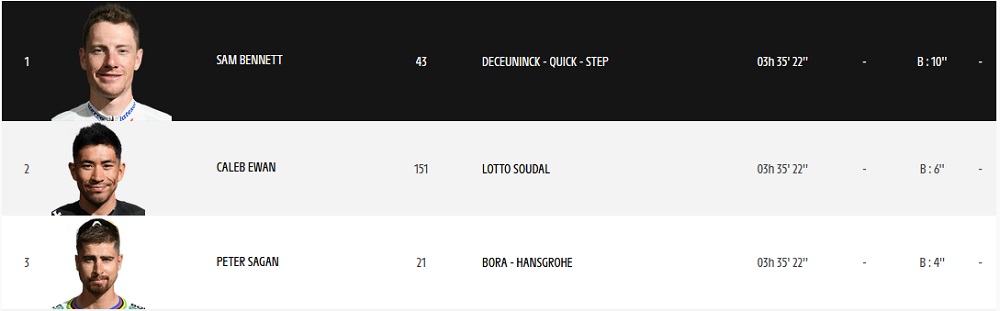 - Maillot Verde (Puntos): Sam Bennett (Deceunick Quick-Step) 196 puntos