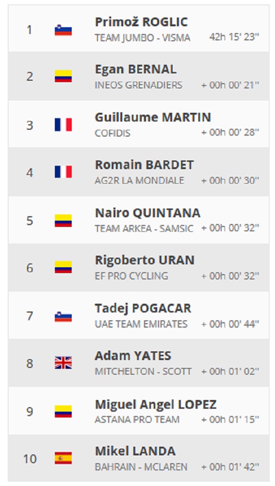 - Maillot Blanco (Joven): Egan Bernal (Ineos Grenadiers) 42h 53′ 01”