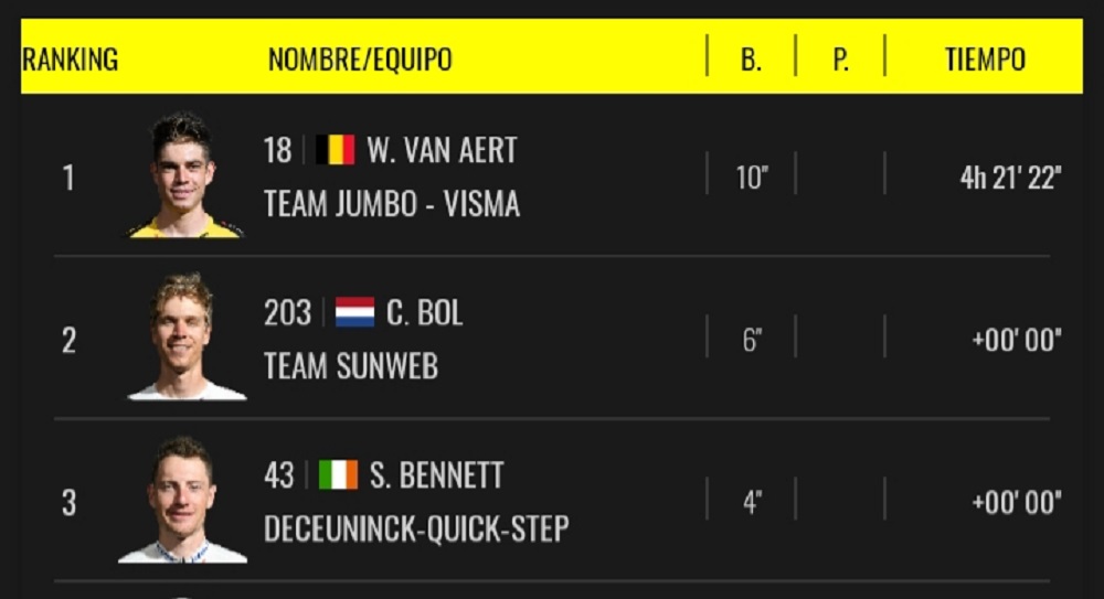 van Aert marcó tiempo 04h 21′ 22», seguido del holandés Bol del Team Sunweb y en tercer lugar el irlandés Sam Bennett de Deceunick Quick-Step, quien acumuló el puntaje que le permitió asumir el liderato por puntos desplazando a Peter Sagan de Bora-Hansgrohe.