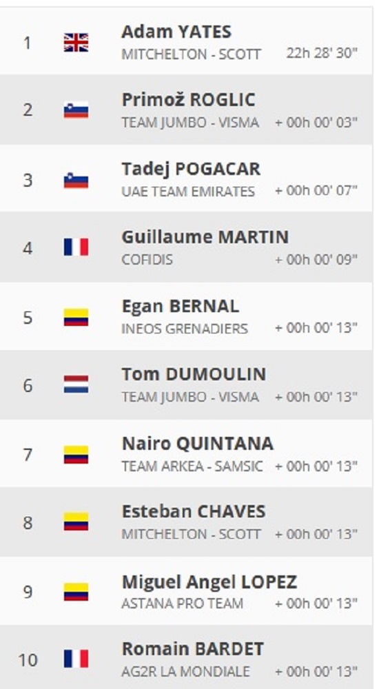 Adam Yates es el nuevo líder general tras cinco etapas con tiempo acumulado de 22h 28′ 30», tomando el primer lugar que tenía Julian Allaphillippe, quien portó el maillot amarillo por tres días consecutivos.
