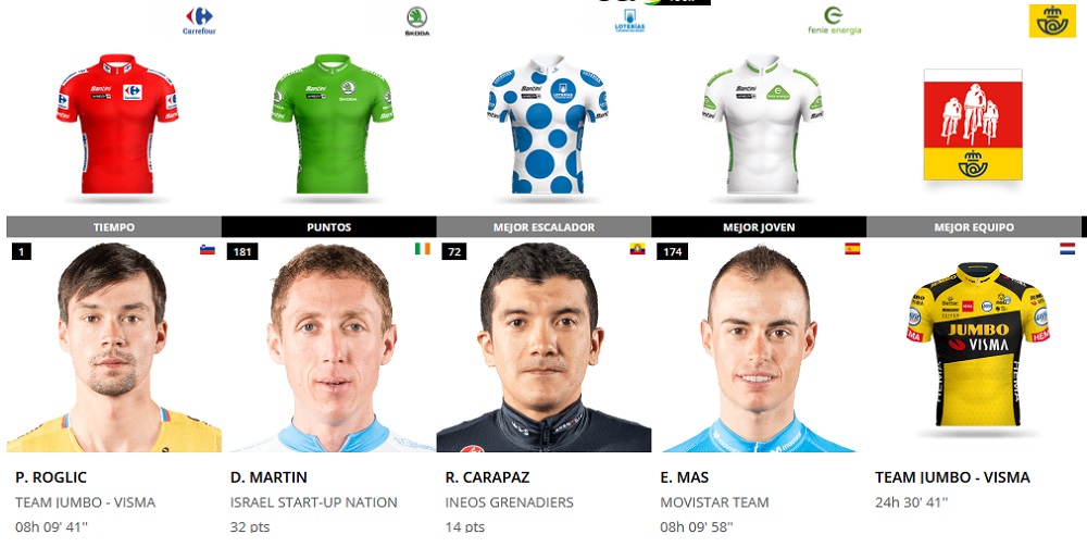 - Maillot Rojo (Clasificación General): Primoz Roglic (Jumbo-Visma) 8:09:41