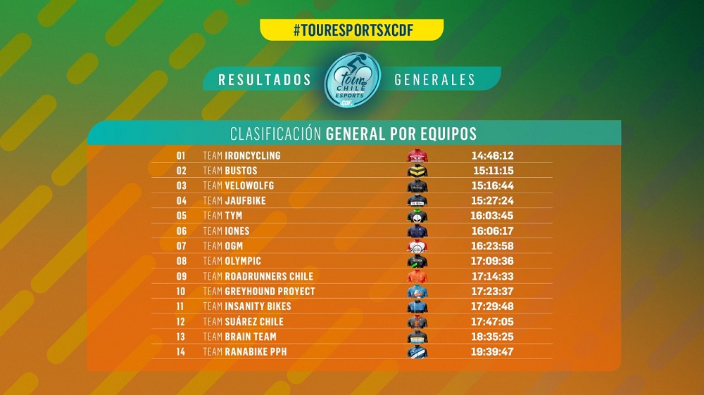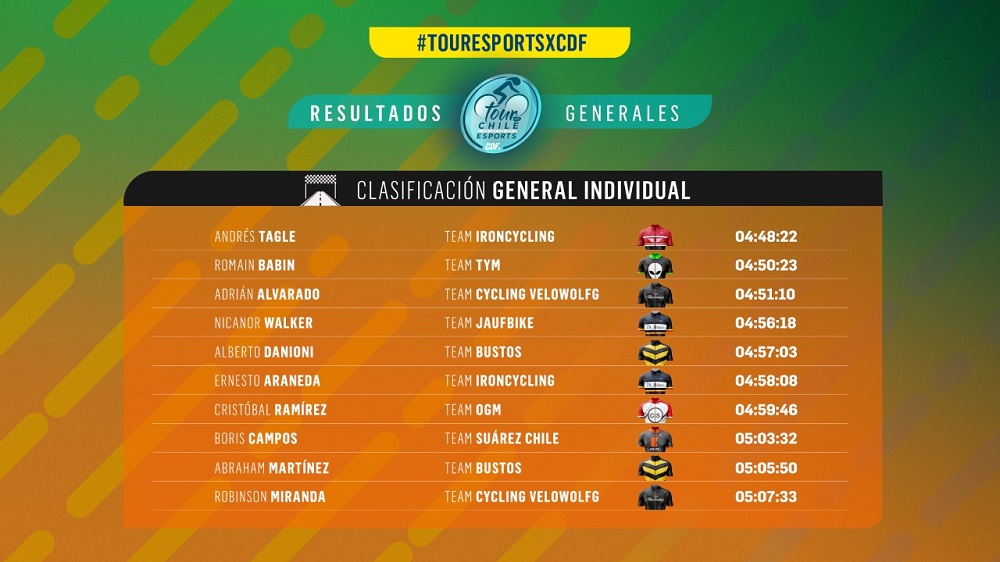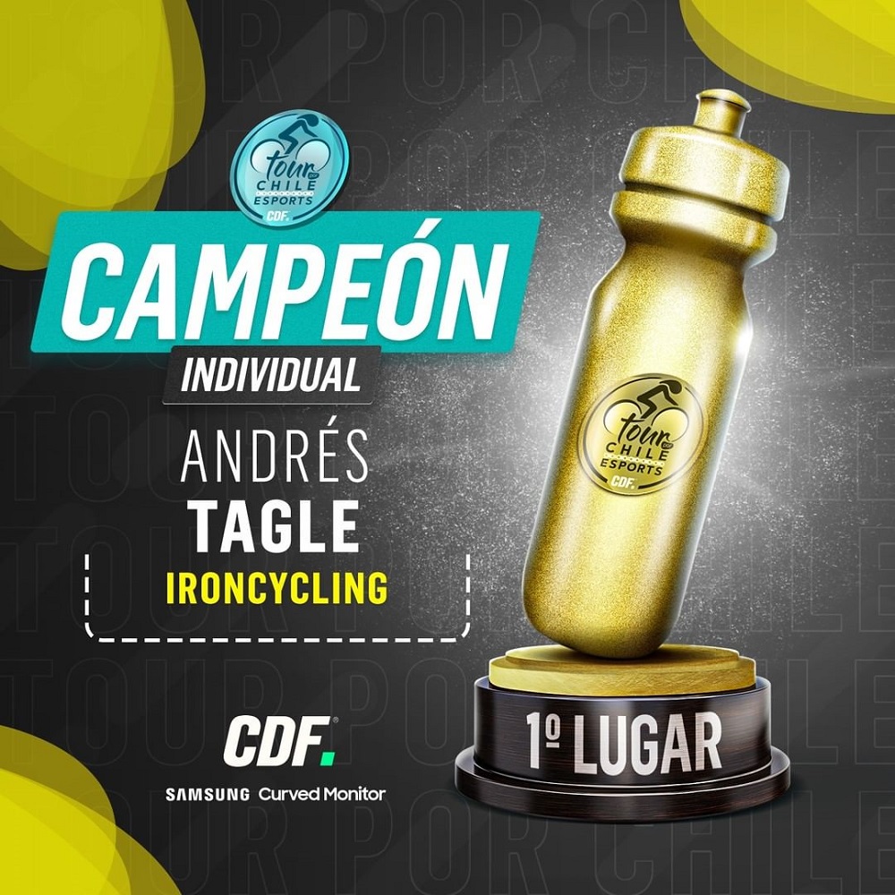 Este miércoles 11 de noviembre se disputó la cuarta y última etapa del Tour por Chile eSports 2020, una competencia de ciclismo virtual en Zwift, que ganó la última fecha y la competencia en general Andrés Tagle y su equipo: el Ironcycling. ¡Felicidades!