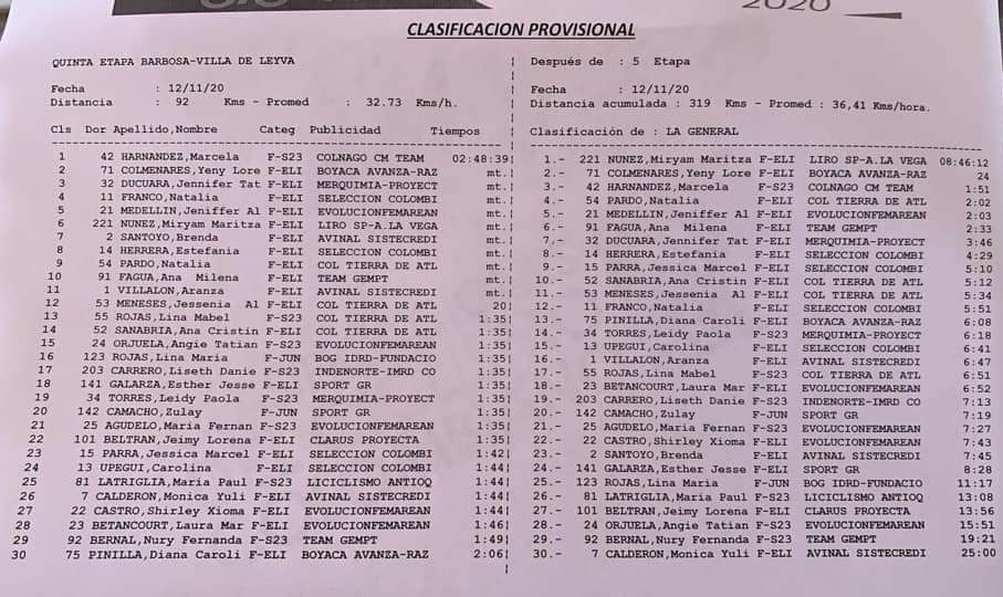 Villalón, campeona del certamen en 2019, se ubicó 11ª en la 5ª y última etapa, que se disputó este miércoles entre las localidades de Barbosa y Villa de Leyva, una etapa de media montaña con 92 km de recorrido, la más larga de la competencia, que ganó la colombiana Marcela Hernández (Colnago CM Team) con tiempo 2:48:39 en el sprint final.