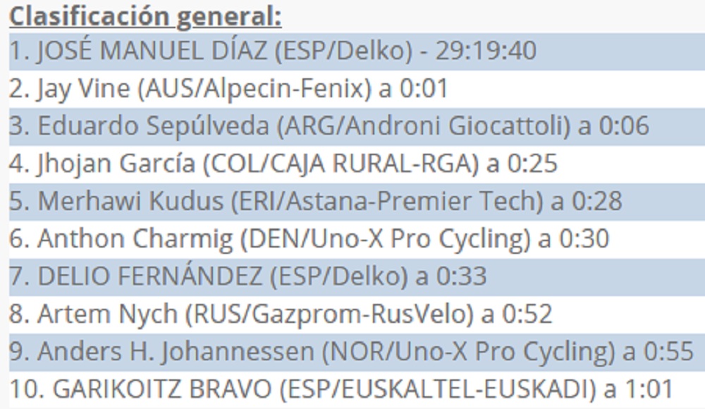 Resalta además José Manuel Díaz, quien firmó una actuación consistente para quedarse con el trono turco. Después de ganar la 5ª etapa de la competencia, desplazó precisamente a Cavendish como líder de la clasificación general y así se mantuvo hasta el final.