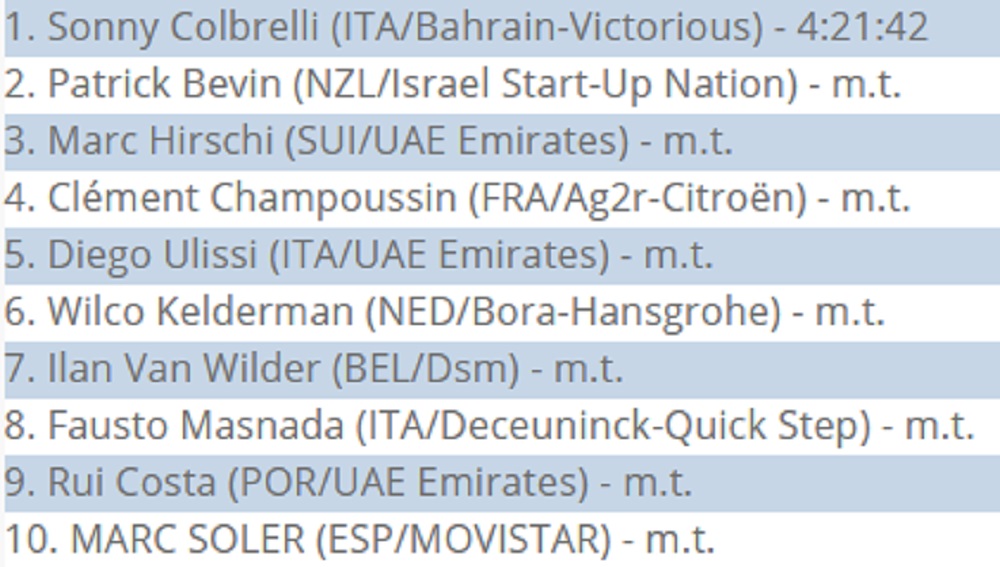 El italiano Sonny Colbrelli (Bahrain Victorius) se impuso en el sprint con un “photo finish” en la meta para ganar la 2ª etapa de la 74ª edición del Tour de Romandia, entre La Neuveville y Saint-Imier con 164.4 km de trayectoria de media montaña, mientras que el australiano Rohan Dennis (Ineos Grenadiers) persistió como líder de la clasificación general.