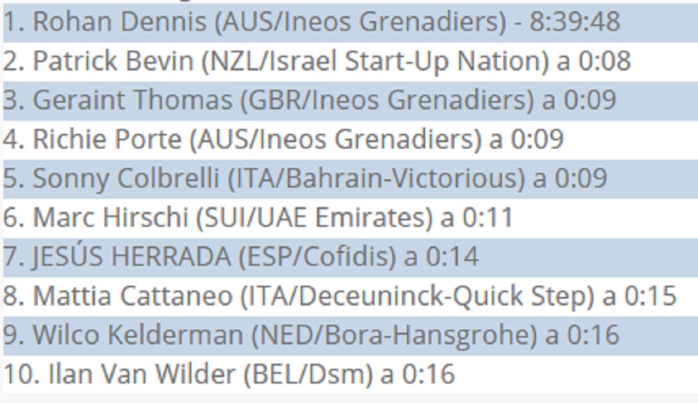 Rohan Dennis sigue vistiendo la camiseta de líder al comandar la clasificación general individual con tiempo total de 8:39:48 por tercer día (ganó la contrarreloj, prólogo del certamen).