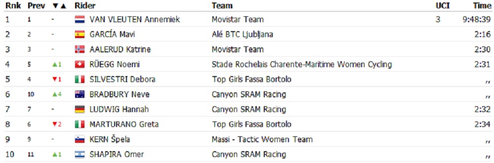 Annemiek Van Vleuten (Movistar Team) preservó el liderato con 9:48:39 de tiempo acumulado, y la chilena ascendió al puesto 64 de la clasificación general a +22:30 del primer lugar.
