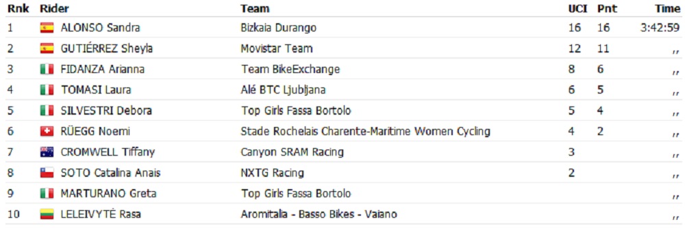 Es el primer top 10 de la chilena en una carrera por etapas, quien se ubicó octava en un pelotón que cruzó la meta y tuvo un dramático final, en el cual se tuvo que determinar a Alonso como ganadora después de un “photo finish”.