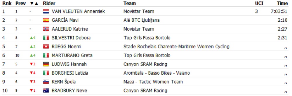 En cuanto a la clasificación general, Soto Campos avanzó 42 peldaños hasta el puesto 71, a + 22:09 de la líder, Annemiek Van Vleuten (Movistar Team) con 7:03:51.