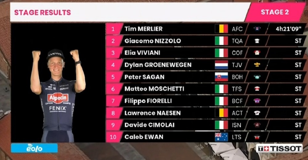 El ciclista belga Tim Merlier (Alpecin-Fenix) ganó este domingo 9 de mayo la segunda etapa del Giro de Italia, de 179 km de recorrido, con un tiempo de 4 horas, 21 minutos con 9 segundos, pero la Maglia Rosa sigue siendo del local Filippo Ganna (Ineos-Grenadiers).