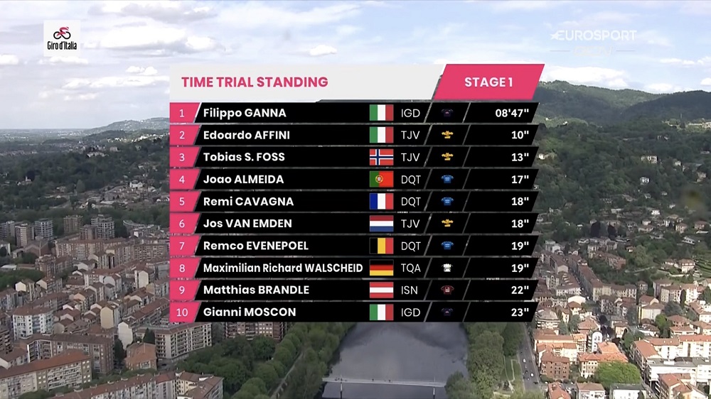 Tras disputarse dos etapas del Giro, el local Filippo Ganna de Ineos Grenadiers sigue siendo el portador de la Maglia Rosa. Esta es la clasificación general: