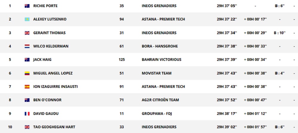 - Maillot Amarillo (líder general): Richie Porte (Ineos Grenadiers) 29:37:05