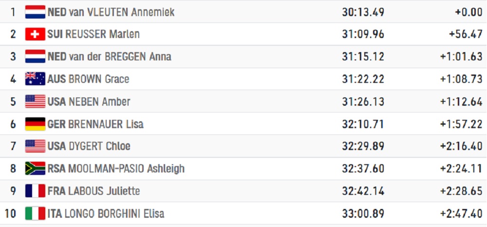 Por su parte, van Vleuten encabezó la prueba femenina de 22,1 km de recorrido, con crono de 30:13.49, seguida por la suiza Marlen Reusser a +56.47 con la medalla de plata y la neerlandesa Anna van der Breggen +1:01.63 con la de bronce.