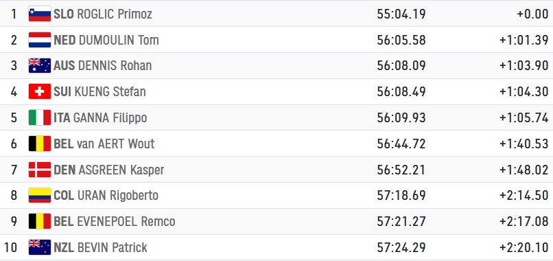 El esloveno fue acompañado en el podio por Tom Dumoulin (Países Bajos) a +1:01.39, quien se colgó la plata y Rohan Dennis (Australia) que obtuvo bronce a +1:03.90.