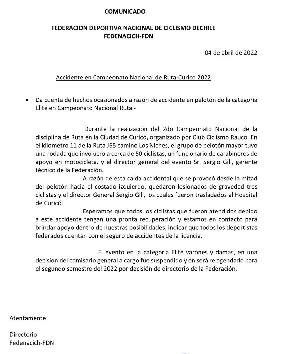 La Federación Deportiva Nacional de Ciclismo de Chile (Fedenacich) se pronunció mediante un comunicado sobre el accidente ocurrido durante la prueba de fondo del 2º Campeonato Nacional de Ruta el pasado domingo 3 de abril.