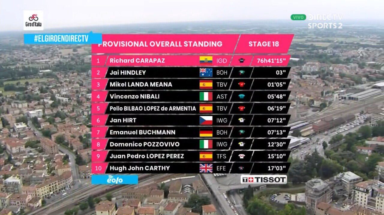 La general, se mantiene liderada por el ecuatoriano Richard Carapaz (Ineos Grenadiers) quien finalizó en el puesto 22° en esta etapa y acumula un tiempo de 76 horas, 41 minutos y 15 segundos con una ventaja de solo 3 segundos con Jai Hindley (Bora-Hansgrohe) , quien se mantiene como escolta del ecuatoriano.