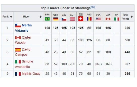 Vidaurre es líder exclusivo de la clasificación con 930 puntos, superando por 350 unidades al canadiense Carter Woods, quien lo escolta en el segundo lugar.