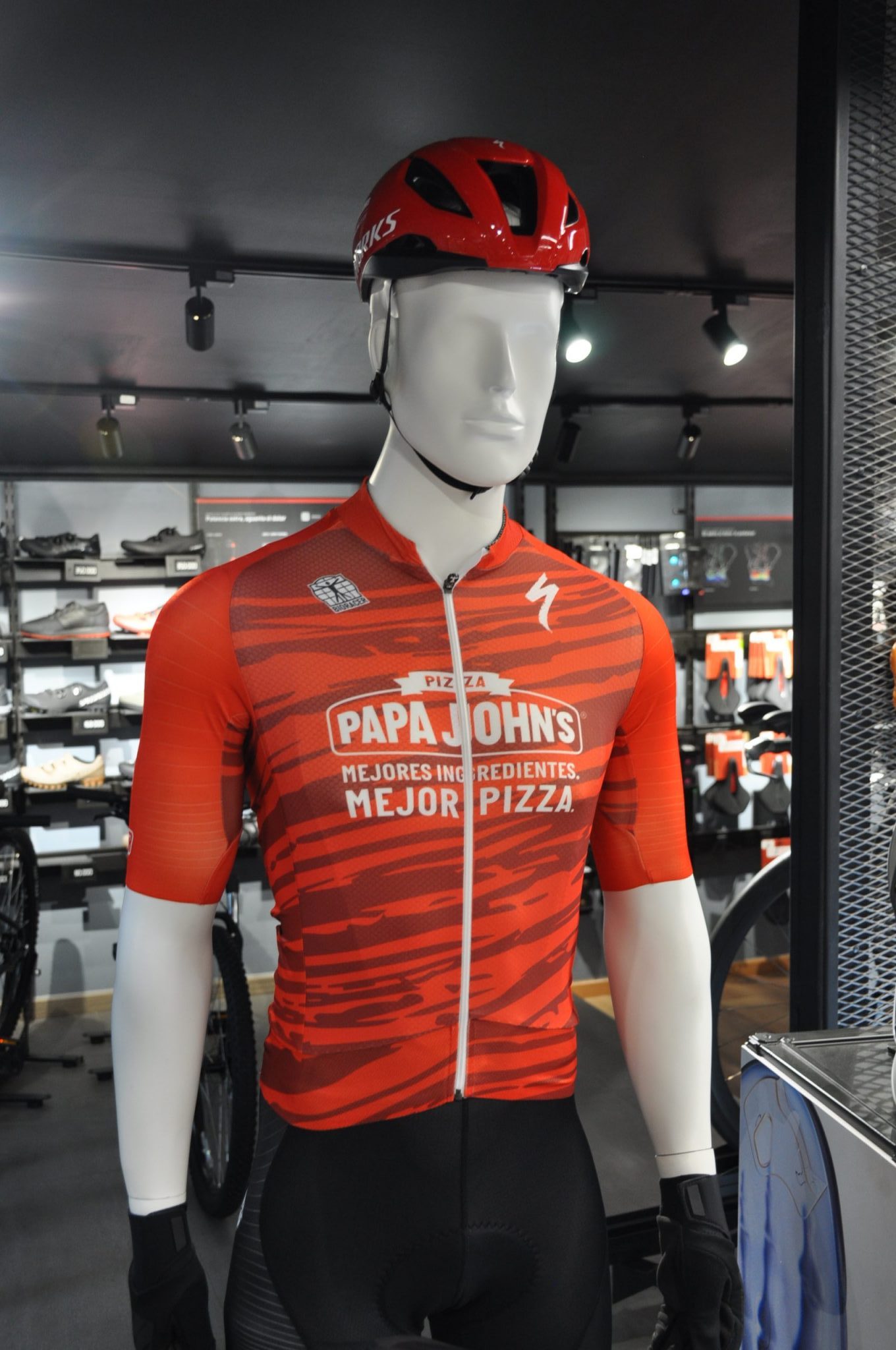 Bioracer es el encargado de hacer la tricota que cuenta con un predominante color rojo sumado al logo del propio fabricante, el de Papa John’s en el centro y el de Specialized a un costado del pecho.