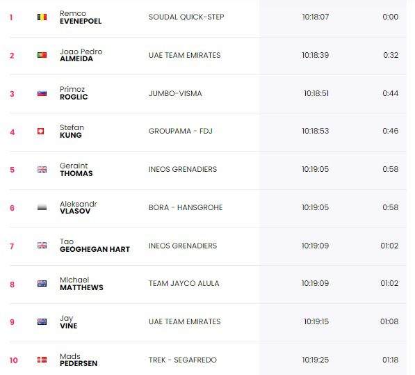 En la clasificación general el belga Remvo Evenepoel (Soudal Quick-Step) sigue liderando la tabla con un tiempo de 10 horas, 18 minutos y 7 segundos, con una ventaja de 32 segundos de su más cercano perseguidor, el portugues Joao Pedro Almeida (UAE Team Emirates), completando el podio el esloveno Primoz Roglic (Jumbo-Visma).