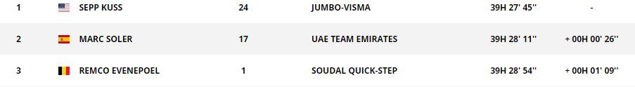 - La Roja (mejor general): Sepp Kuss (Jumbo-Visma): 39:27:45