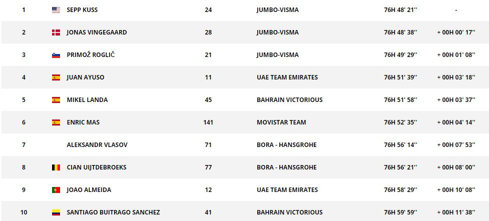 - La Roja (mejor general): Sepp Kuss (Jumbo-Visma): 76:48:21